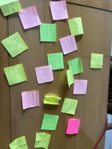 During the first part of the workshop, students placed Post-it notes on the front table, identifying the communities to which they belong. Next, the students shared their experiences within those communities with their peers. This exercise encouraged students to reflect on what the term community means and to consider how they personally engage with their own communities.